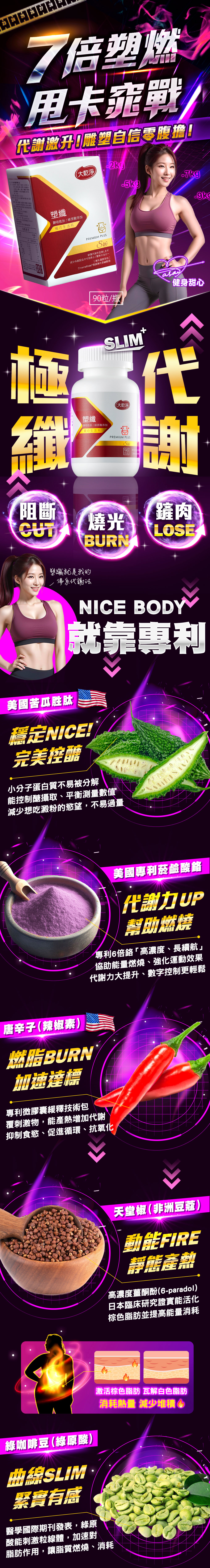 塑纖特別針對亞洲人體質與訴求,請營養師量身搭配黃金比例,嚴選美國專利成分,複方結合多種天然植物萃取,有效增加代謝率、預防體脂堆積、調節生理機能、降低食慾、幫助達成目標。